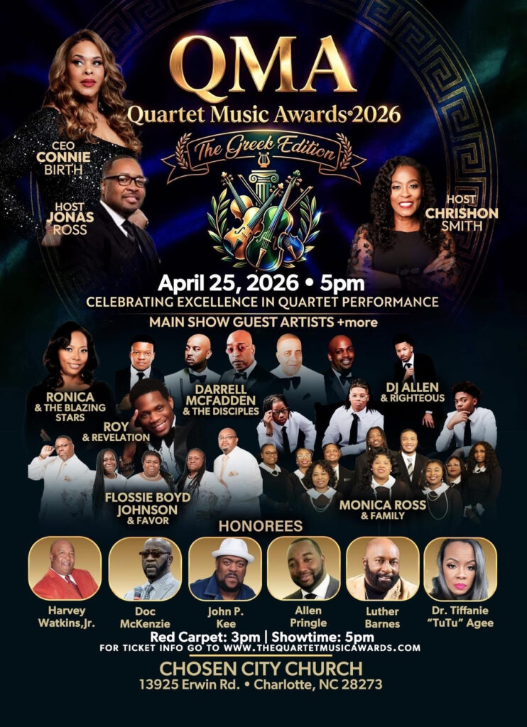 Charlotte is set to become the center of gospel celebration as the Quartet Music Awards® (QMA®) returns for its 4th annual show on Saturday, April 25, 2026. Known for bringing together some of the most powerful voices in quartet gospel, the event will welcome fans, artists, and industry leaders for a weekend filled with dynamic performances, heartfelt worship, and well-deserved recognition. More than just an awards show, the event founded by Connie Brith promises to be a weekend experience that highlights a genre deeply rooted in the church while continuing to expand its reach to new audiences and a new generation of artists.